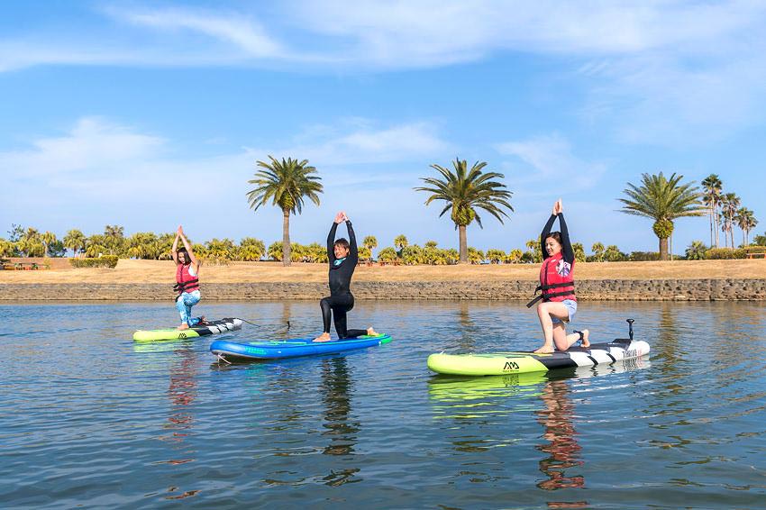 ハワイで人気のサップヨガを宮崎でも体験!サーフボードよりも大きいボードの上で水に揺られながらゆったりヨガをする注目のマリンアクティビティです