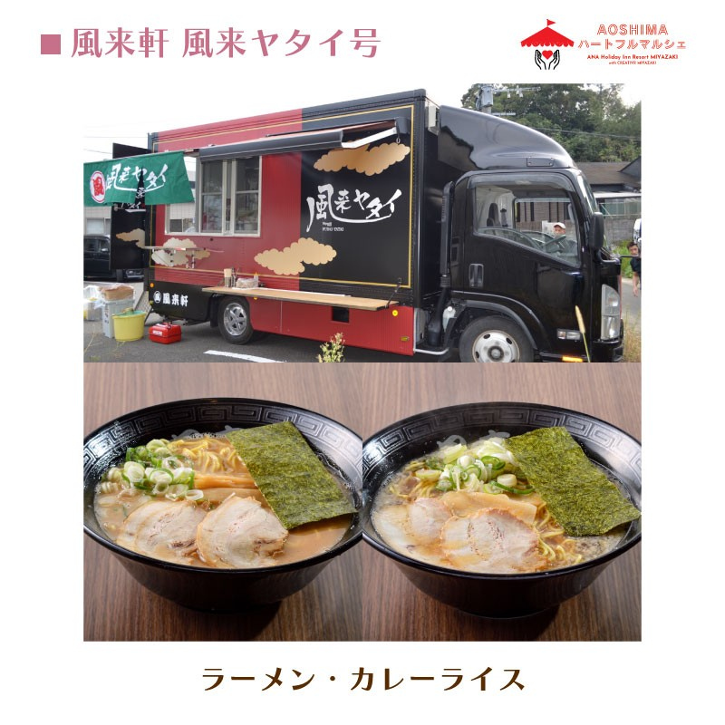■風来軒 風来ヤタイ号 おなじみ宮崎濃厚とんこつラーメン、魚介の出汁のきいたあっさりしょうゆラーメン、こだわりスパイスのチキンカレー