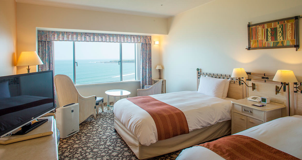 地下1階、地上9階の青島ビーチを見渡せる半円形の建物で、客室ごとに見える景色が異なります