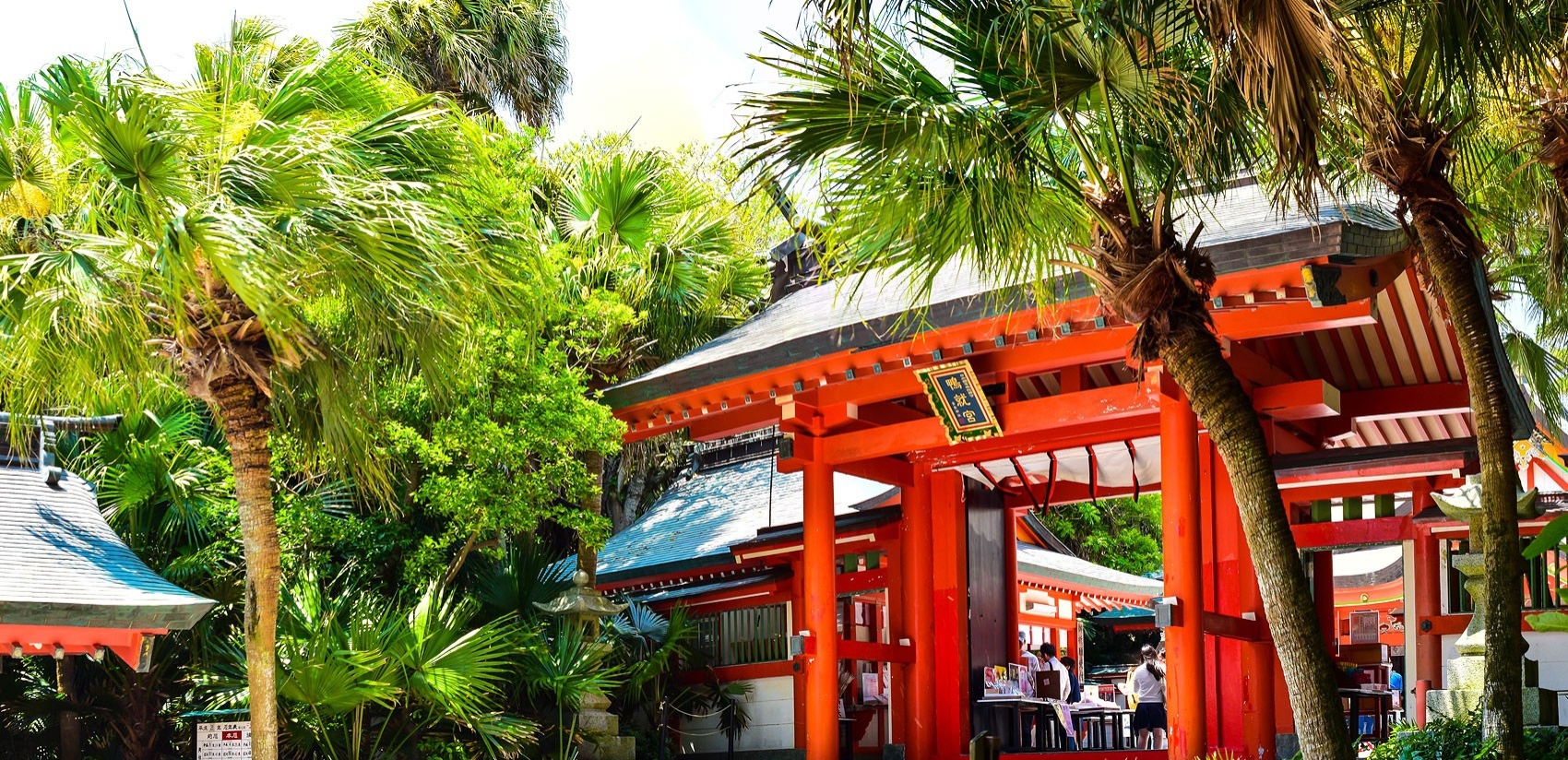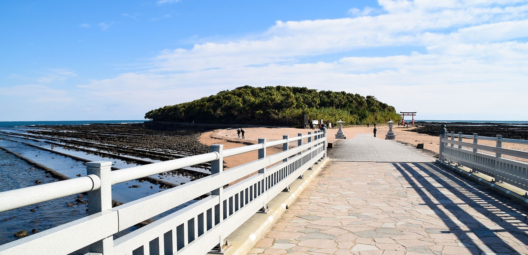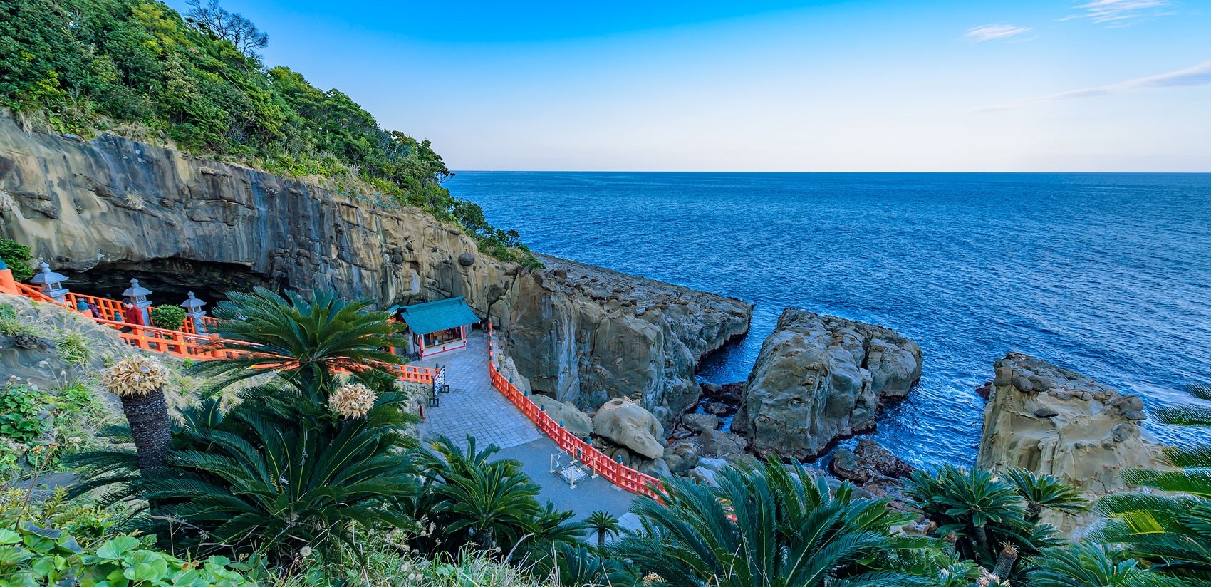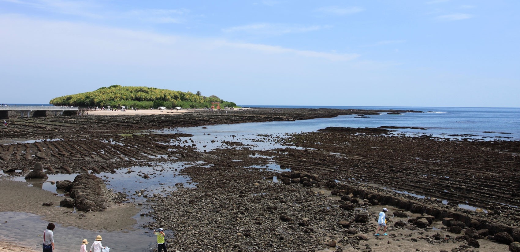 島全体が鬼の洗濯板と呼ばれる波状岩に囲まれ、植物・岩石ともに国の天然記念物で、中心には神話の舞台である青島神社が鎮座し、パワースポットとしても注目されています。