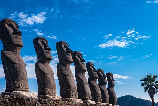 世界で唯一完全復刻したモアイ像がシンボルの日南海岸の公園。園内の7体のモアイ像はいずれも本物と同じ凝灰石でできており、右から2番目は金運、左から3番目のモアイに触ると恋愛運があがると言われています。