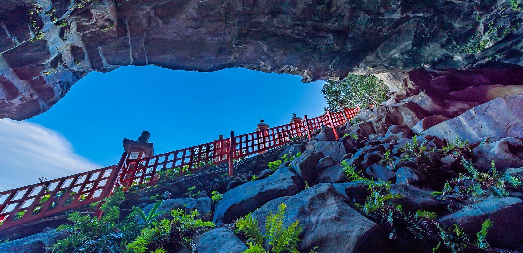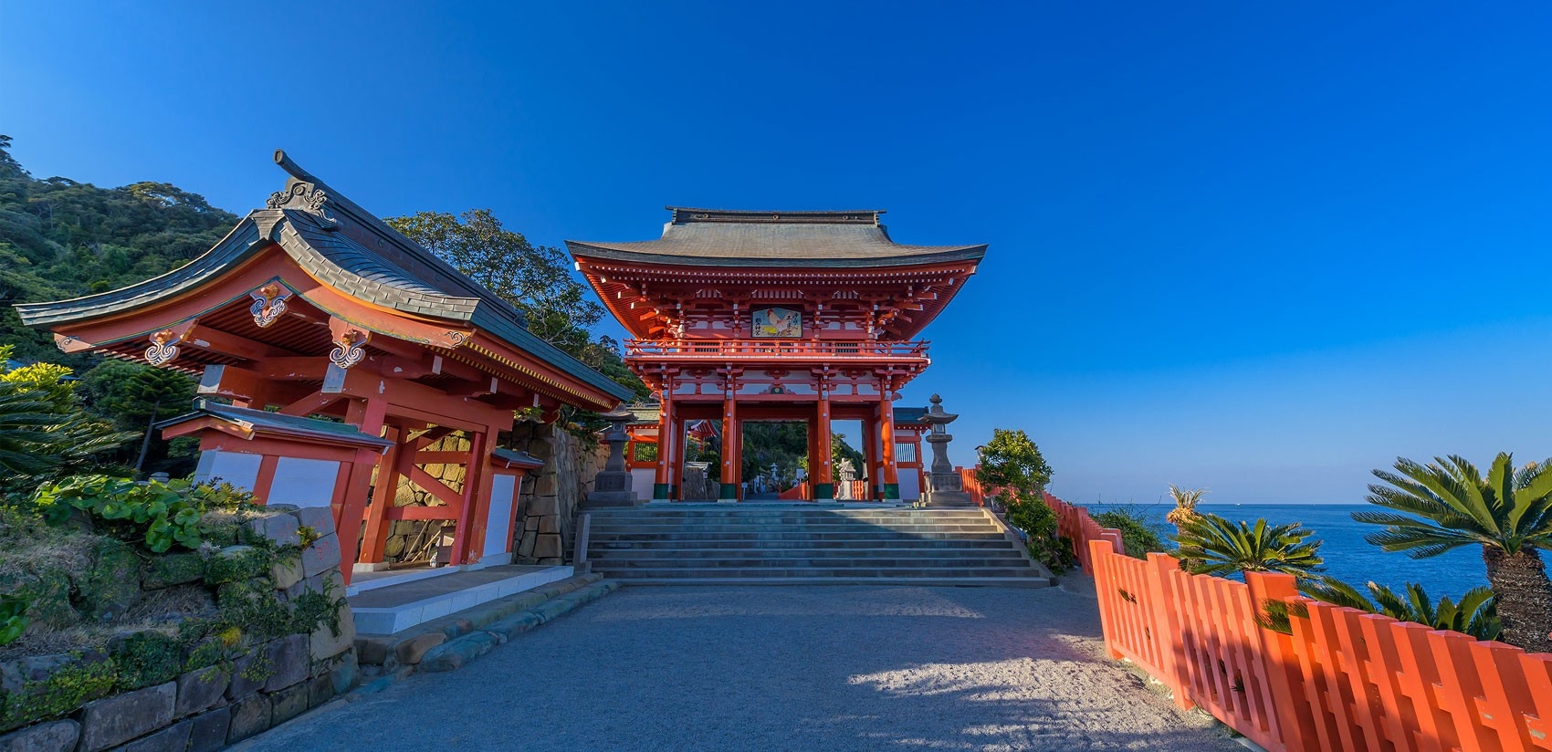 突き出した鵜戸崎岬の突端にある洞窟の中に、朱塗りの色鮮やかな御本殿が鎮座する珍しいもので、奇岩・怪礁が連なり荒波が打ち寄せる美しい景勝地です。