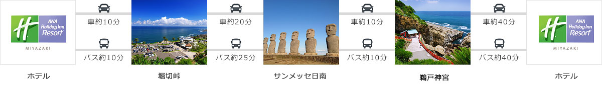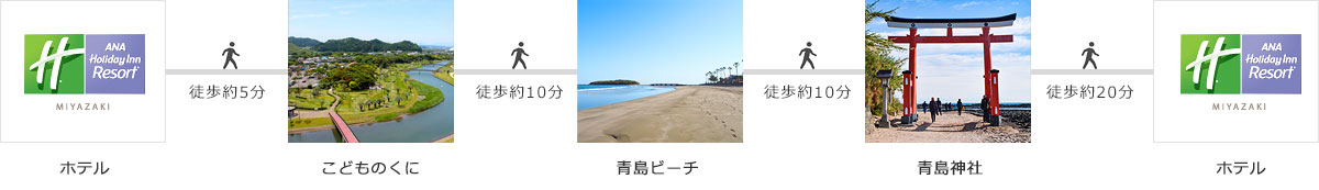 宮崎空港から車で15分、宮崎ICから車で20分、最寄JR子供の国駅から徒歩7分とアクセスも良く、青島観光だけでなくランチとセットで日帰り温泉のご利用にも適しています。